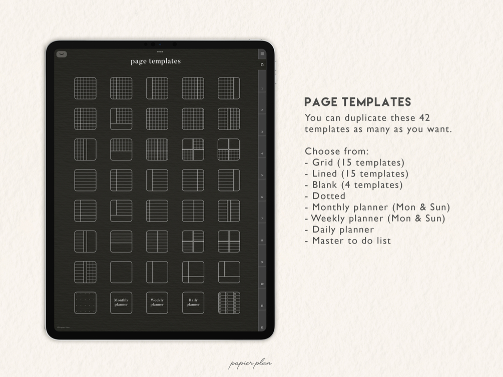 - Comes with 42 page templates (such as grid, lined, dotted, cornell, column, etc) that you can duplicate to the notebook section that you want many times you want